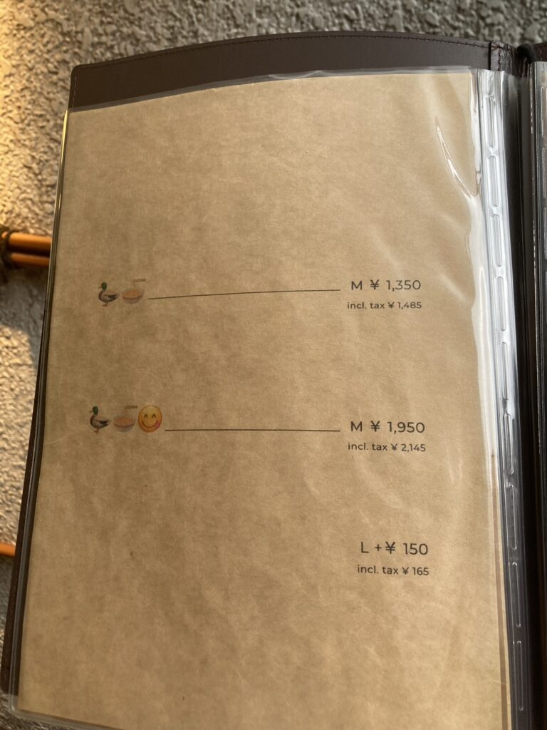 普通の鴨ラーメンが上の絵文字で下が特製鴨ラーメンという意味